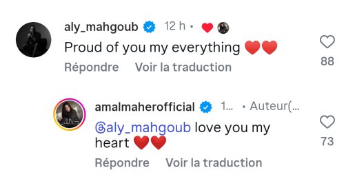 وعلق علي محجوب على إحدى صورها من جلسة تصوير حديثة قائلا: “فخور بك يا كل شيء بالنسبة لي”، وردت عليه الفنانة بكلمات حب صريحة: “أحبك ياقلبي”، لتوضح بذلك طبيعة العلاقة بينهما بكل وضوح.