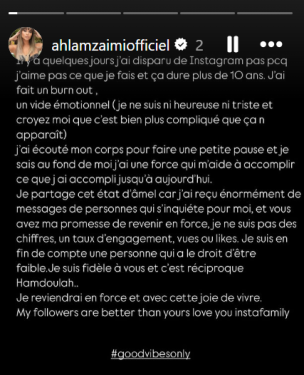 وأكدت الزعيمي أن سبب مشاركتها لهذا الاعتراف هو الكم الكبير من الرسائل التي توصلت بها من متابعيها الذين عبروا عن قلقهم واهتمامهم بحالتها، وقالت: “أشارككم هذا لأنني تلقيت العديد من الرسائل من أشخاص قلقين علي، أعدكم أنني سأعود بقوة..”.