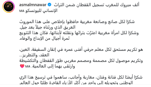 احتفت الفنانة المغربية، أسماء لمنور بقرار اللجنة الحكومية لصون التراث غير المادي التابعة لمنظمة “اليونسكو”، التي صادقت يوم الأربعاء المنصرم، على تسجيل القفطان المغربي تراثا عالميا ضمن قائمة التراث الإنساني.