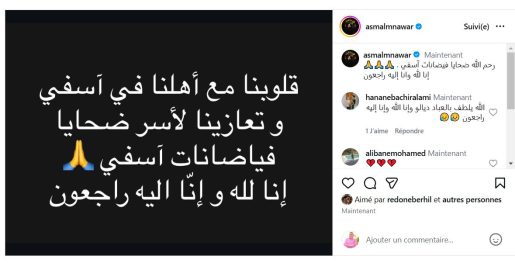 ونشرت أسماء لمنور تدوينة مؤثرة عبر حسابها الرسمي على موقع “إنستغرام”، عبرت من خلالها عن حزنها العميق وتعازيها الصادقة لأسر الضحايا، قائلة: “قلوبنا مع أهلنا في آسفي، وتعازينا لأسر ضحايا الفيضانات، إنا لله وإنا إليه راجعون”، في رسالة لاقت تفاعلا واسعا من متابعيها وزملائها في الوسط الفني.