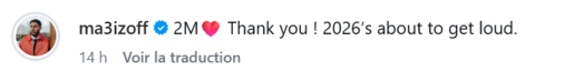 وأشار “معيز” في المنشور نفسه إلى أن سنة 2026 ستكون، حسب تعبيره “عاما صاخبا”، في إشارة منه إلى مشاريع فنية مرتقبة يستعد للكشف عنها خلال الفترة المقبلة.