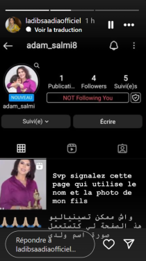 طلبت الفنانة المغربية، السعدية لديب من متابعيها على منصة “إنستغرام”، مساعدتها في التبليغ عن حساب وهمي ينتحل شخصية ابنها.