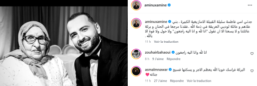 وكتب “أمينوكس”: “جدتي أمي فاطمة سليلة القبيلة الأمازيغية الكبيرة بني علاهم وعائلة لوديي العريقة في ذمة الله.. فقدنا مرجعا في الحنان وبركة عائلتنا، ولا يسعنا إلا أن نقول إنا لله وإنا إليه راجعون، ولا حول ولا قوة إلا بالله”.