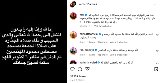 ولم يكشف الفنان عن سبب الوفاة أو ما إذا كان والده يعاني من أي أزمة صحية في الفترة الأخيرة، مكتفيا بإعلان الخبر والدعاء له بالرحمة.