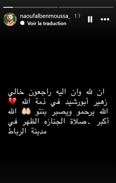 فجع الممثل المغربي، نوفل بنموسى صباح اليوم الثلاثاء، بوفاة خاله زهير أبو رشيد، وفق ما أعلن عنه عبر حسابه الشخصي على “الإنستغرام”.