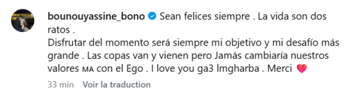 وكتب الحارس الدولي المغربي: “كونوا سعداء دائما، الحياة مجرد لحظات عابرة، الاستمتاع باللحظة سيظل دائما هدفي وأكبر تحد لي. الكؤوس تذهب وتأتي، لكنني لن أستبدل قيمنا أبدا بالأنانية. أحب جميع المغاربة، شكرا”.