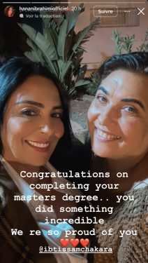 ونشرت الإبراهيمي صورة جمعتها بابتسام شكارة عبر خاصية “الستوري” بحسابها الرسمي “إنستغرام”، وأرفقتها برسالة مؤثرة جاء فيها: “هنيئا لك بنيلك شهادة الماستر.. قمت بشيء رائع فعلا ، نحن فخورون بك جدا”.