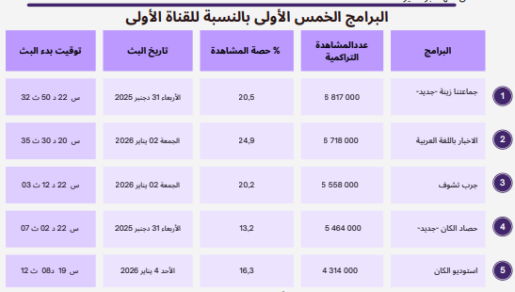 تصدر الموسم الجديد من البرنامج الفني “جماعتنا زينة” قائمة الأعمال الأكثر مشاهدة على القناة “الأولى” خلال الأسبوع الأول من شهر يناير، محققا انطلاقة قوية أكدت مكانته ضمن أبرز البرامج الفنية المغربية.
