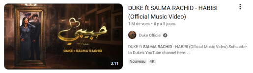 حققت أغنية “حبيبي”، التي جمعت الفنانة المغربية، سلمى رشيد والفنان، DUKE نجاحا لافتا بعد تجاوزها حاجز المليون مشاهدة على منصة اليوتيوب خلال خمسة أيام فقط من إصدارها.