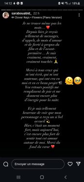 وأوضحت بوعابد في تدوينة نشرتها عبر حسابها على “إنستغرام” أنها تلقت عددا كبيرا من الرسائل والمكالمات من محبيها وأصدقائها بعد العرض، أعربوا من خلالها عن إعجابهم بالفيلم وفخرهم بمشاركتها فيه.