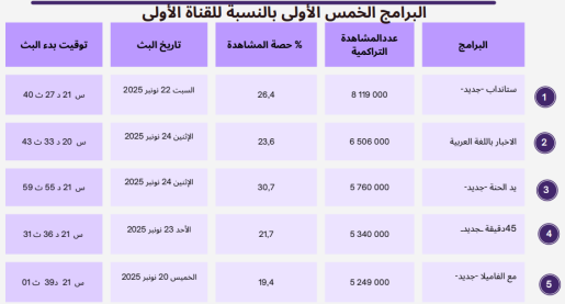 ويواصل برنامج “ستانداب” ترسيخ حضوره القوي منذ عودته في موسمه الجديد، إذ تصدر قائمة البرامج الأكثر مشاهدة على القناة الأولى، مستقطبا جمهورا واسعا من مختلف الفئات العمرية.