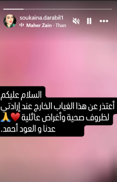 ونشرت درابيل تدوينة على حسابها الرسمي بـ “إنستغرام”، أوضحت من خلالها سبب غيابها، قائلة: “أعتذر عن هذا الغياب الخارج عن إرادتي لظروف صحية وأغراض عائلية”.