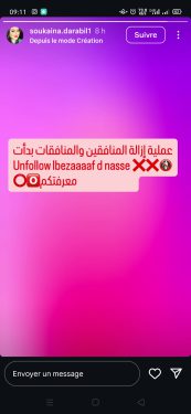 أثارت الفنانة المغربية، سكينة درابيل تفاعل متابعيها عبر مواقع التواصل الاجتماعية، بعد أن نشرت “ستوري” على حسابها الرسمي في تطبيق “إنستغرام”، أعلنت فيها عن بدء ما وصفته بـ”عملية إزالة المنافقين والمنافقات”، في إشارة منها إلى قيامها بحذف عدد من الأشخاص من قائمة متابعيها.