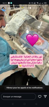 ونشرت صوفيا صورة لطفلتها داخل الحاضنة الطبية، مرفقة برسالة مؤثرة كتبت فيها:”نور باقا في العناية فالمستشفى، دعيو معايا تبرى ويخرجوها ليا دغيا، مازال حتى ما شفتها مزيان، لا أنا لا دارنا”.