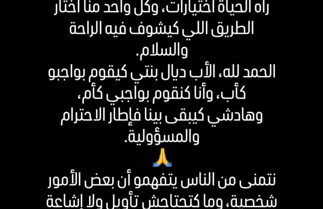 وعبرت عن امتنانها لأن العلاقة السابقة تكللت بالاحترام، خاصة فيما يتعلق برعاية ابنتهما، مؤكدة أن الطرفين يقومان بواجباتهما تجاهها بكل مسؤولية، مشددة على أن ما يجمعها بوالد ابنتها سيبقى إطارا من التقدير المتبادل، رافضة تحويل الأمر إلى مادة للنقاش أو التأويل، إذ اعتبرت أن بعض التفاصيل تبقى شخصية ولا تحتاج إلى تبرير أو إشاعة.