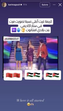 وأظهر الفيديو الذي نشرته غيث عبر خاصية “الستوري”، لحظة إعلان حصولها على أعلى نسبة تصويت خلال إحدى حلقات البرنامج، وسط أجواء من الفرح والتصفيق من طرف زملائها المشاركين داخل الأكاديمية، وهي اللحظة التي شكلت محطة مهمة في مسارها الفني.
