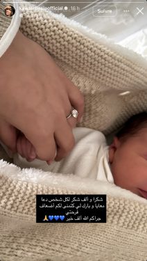 ونشرت تيسية صورة مؤثرة عبر خاصية “الستوري” المتواجدة بحسابها الرسمي “إنستغرام”، وهي تمسك بيد مولودها الجديد، وعلقت عليها: “شكرا وألف شكر لكل شخص دعا معايا وبارك لي، كنتمنى لكم أضعاف فرحتي.. جزاكم الله ألف خير”.