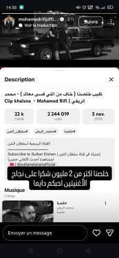 احتفل الفنان المغربي، محمد الريفي بنجاح أغنيتيه “خلصنا” و”بعت اللي شاريك” من خلال منشورات على حسابه بموقع “إنستغرام”، إذ شارك متابعيه أرقام المشاهدات التي حققتها الأعمال على موقع “يوتيوب”.