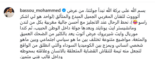 يستعد الكوميدي المغربي، محمد باسو للانطلاق في جولة فنية جديدة بعرضه الكوميدي “أتوت”، حسب ما روج له عبر حسابه الشخصي على “إنستغرام”، إذ نشر تواريخ العروض والمدن التي سيحل بها خلال هذه الجولة.