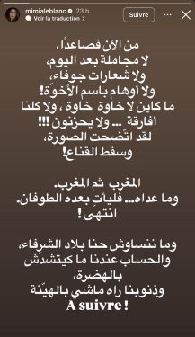 وكتبت “Mimia Leblanc” بأسلوب حاد وصريح في تدوينة شاركتها عبر خاصية “الستوري” بحسابها الرسمي “إنستغرام”: “من الآن فصاعدا، لا مجاملة بعد اليوم، ولا شعارات جوفاء، ولا أوهام باسم الأخوة، ما كاين لا خاوة خاوة، ولا كلنا أفارقة ولا يحزنون.. لقد اتضحت الصورة وسقط القناع، المغرب ثم المغرب وما عداه.. فليأت بعده الطوفان انتهى”.