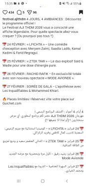ويواصل المهرجان فقراته يوم 26 فبراير مع الكوميدي المغربي، رشيد رفيق الذي يطل لأول مرة بعرضه الجديد “Mode Avionde”، في تجربة كوميدية منتظرة تحمل بصمته الخاصة.