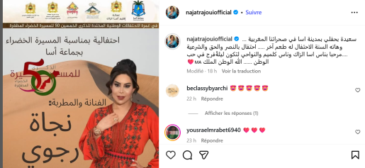 ونشرت الفنانة تدوينة عبر حسابها على “إنستغرام”، قالت فيها: “شكون فرحان بحالي؟ أحييت سهرات كثيرة في الصحراء المغربية، لكن هذه المرة إحساس مختلف.. الاحتفال له طعم آخر، احتفال بالنصر والحق والشرعية”.