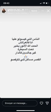 وجاءت رسالة نرجس الحلاق بعد تداول أخبار وصور عن الفيضانات التي عرفتها القصر الكبير نتيجة التساقطات المطرية الغزيرة، ما دفع عددا من المتابعين إلى التساؤل عن وضعها، خاصة وأن اسمها ارتبط بالمدينة خلال الفترة الماضية.