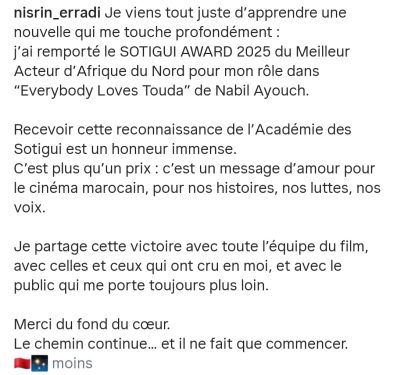 وأعربت الراضي عن سعادتها العميقة بهذا التتويج، مؤكدة أن هذا التكريم يمثل لها “أكثر من جائزة”، بل “رسالة حب للسينما المغربية وقصصها وأصواتها ونضالاتها”، وفق ما كتبته في منشور شاركته مع متابعيها على “الإنستغرام”.