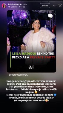 خرجت عارضة الأزياء المغربية، ليلى الحديوي، عن صمتها مساء أمس الأربعاء، بعد تداول إشاعات تفيد بتغيير مسارها المهني، وذلك عقب انتشار صور لها وهي تقوم بعملية “DJ Mix”، ما دفع البعض للاعتقاد بأنها ستتحول إلى “دي جي” محترفة.