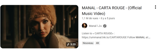 حققت الفنانة المغربية، منال بنشليخة نجاحا لافتا فور طرح عملها الجديد “Carta Rouge”، إذ تجاوز الفيديو كليب مليون مشاهدة على قناتها الرسمية بمنصة “اليوتيوب” في وقت وجيز.